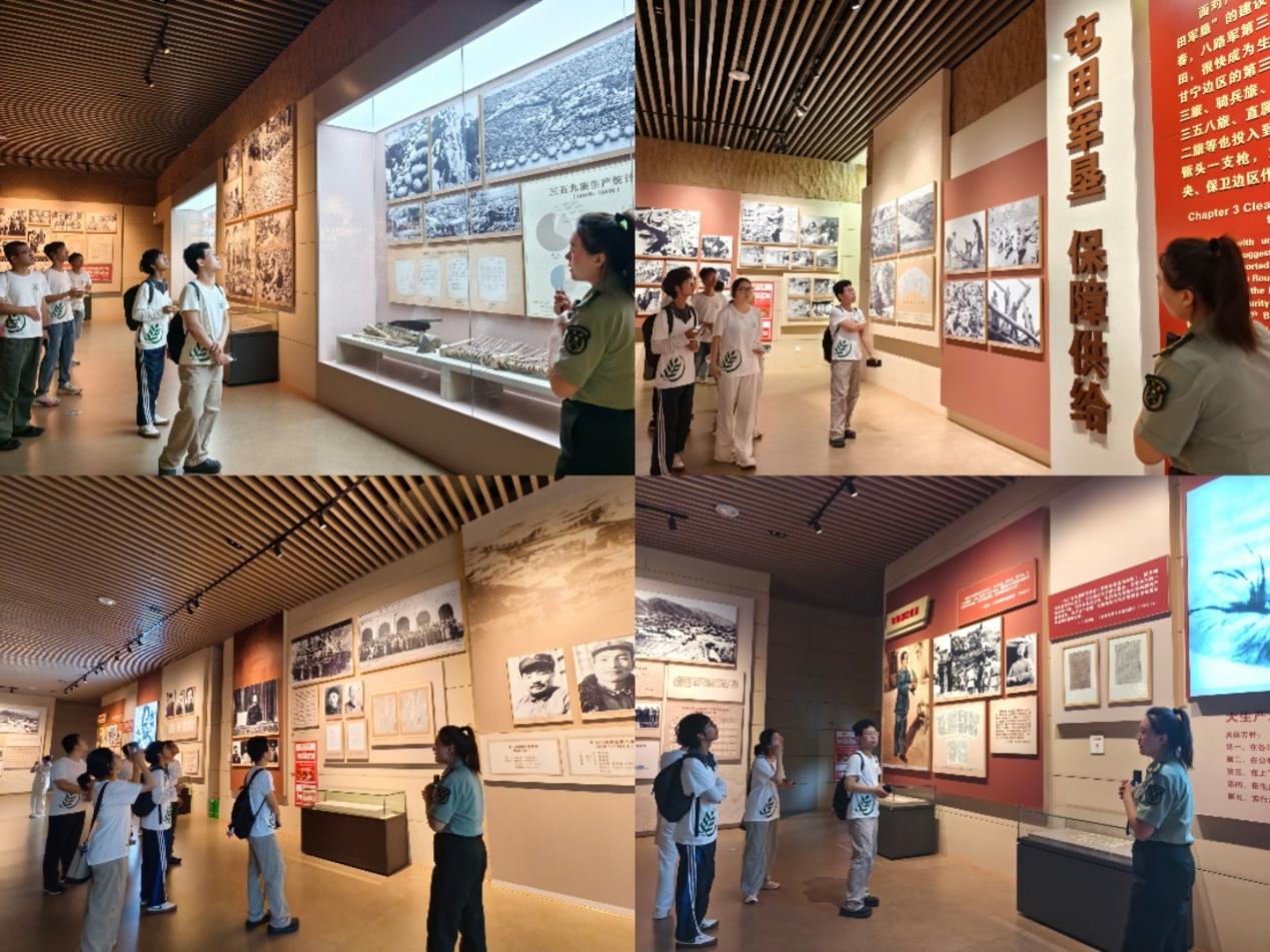 怀着这份敬佩之情,调研团队前往南泥湾大生产纪念馆进行学习。团队成员依次参观了“陕北江南开荒记”“军民同心大生产”“艰苦奋斗铸丰碑”等主题展区。馆内陈设的泛黄的劳动工具、手写的劳动竞赛奖状、复原的大生产场景复原图,将大家带回了1941年三五九旅响应党中央号召、开赴南泥湾屯田垦荒的历史现场,面对日寇的疯狂进攻和国民党顽固派的经济封锁,陕甘宁边区陷入严重的物资匮乏困境,为打破困境,战士们在荒无人烟的南泥湾开荒种地、发展生产,创造了“自力更生、艰苦奋斗”的南泥湾精神。在讲解老师的生动讲述中,团队成员通过一件件珍贵文物、一组组历史影像、一段段奋斗故事,深入探寻南泥湾精神的核心内涵,为后续分析红色场馆在加强大学生理想信念教育中的作用积累了一手资料。