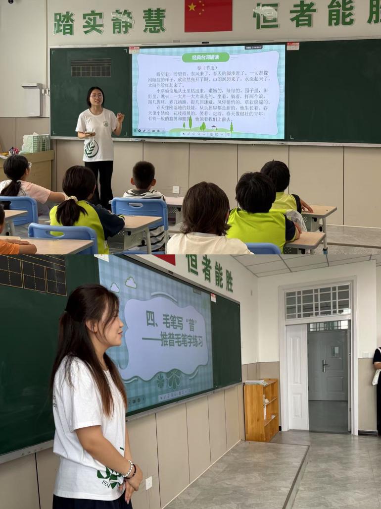 成员熊敏和努尔孜亚组织的“趣味学写毛笔字”“智慧猜字谜”“emoji猜成语”等活动,用生动形象的表情符号激发孩子们的联想力,在破译成语的乐趣中丰富词汇储备。现场踊跃参与,气氛热烈。实践团成员们用青春活力搭起桥梁,让“语润丝路”的种子在一个个稚嫩的声音里悄悄发芽。