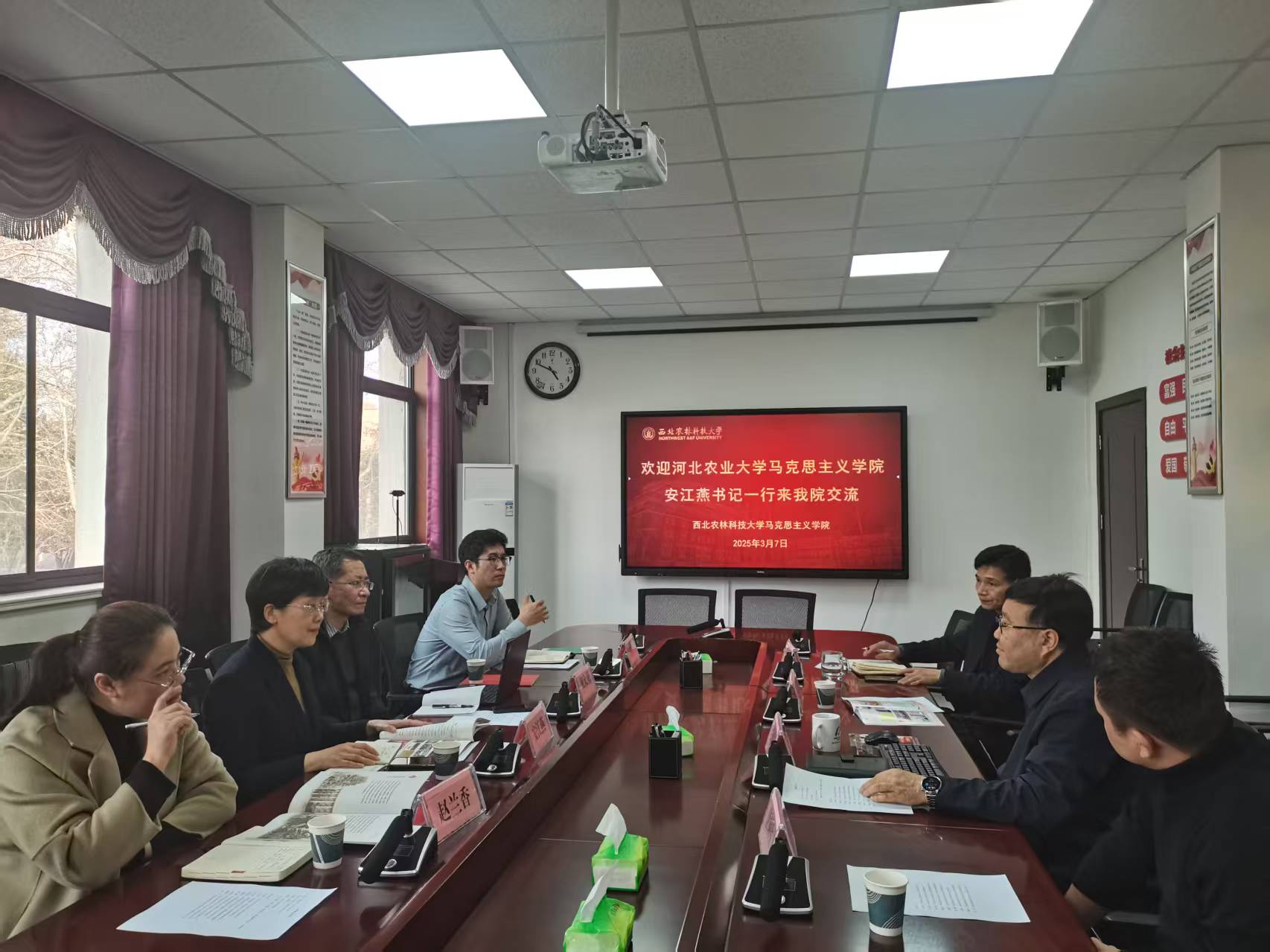3月7日下午,河北农业大学新葡的京集团35222vip党委书记安江燕、副院长祝大勇、原理教研室主任赵兰香、思修教研室教师窦星辰一行4人来新葡的京集团官网调研,双方围绕党建工作、马克思主义理论学科建设、思政课教学改革、社会服务等方面开展座谈交流。学院党委书记闫德忠、院长杨鹏、副书记王家武、原理系主任唐树生、办公室人员参加了座谈会。