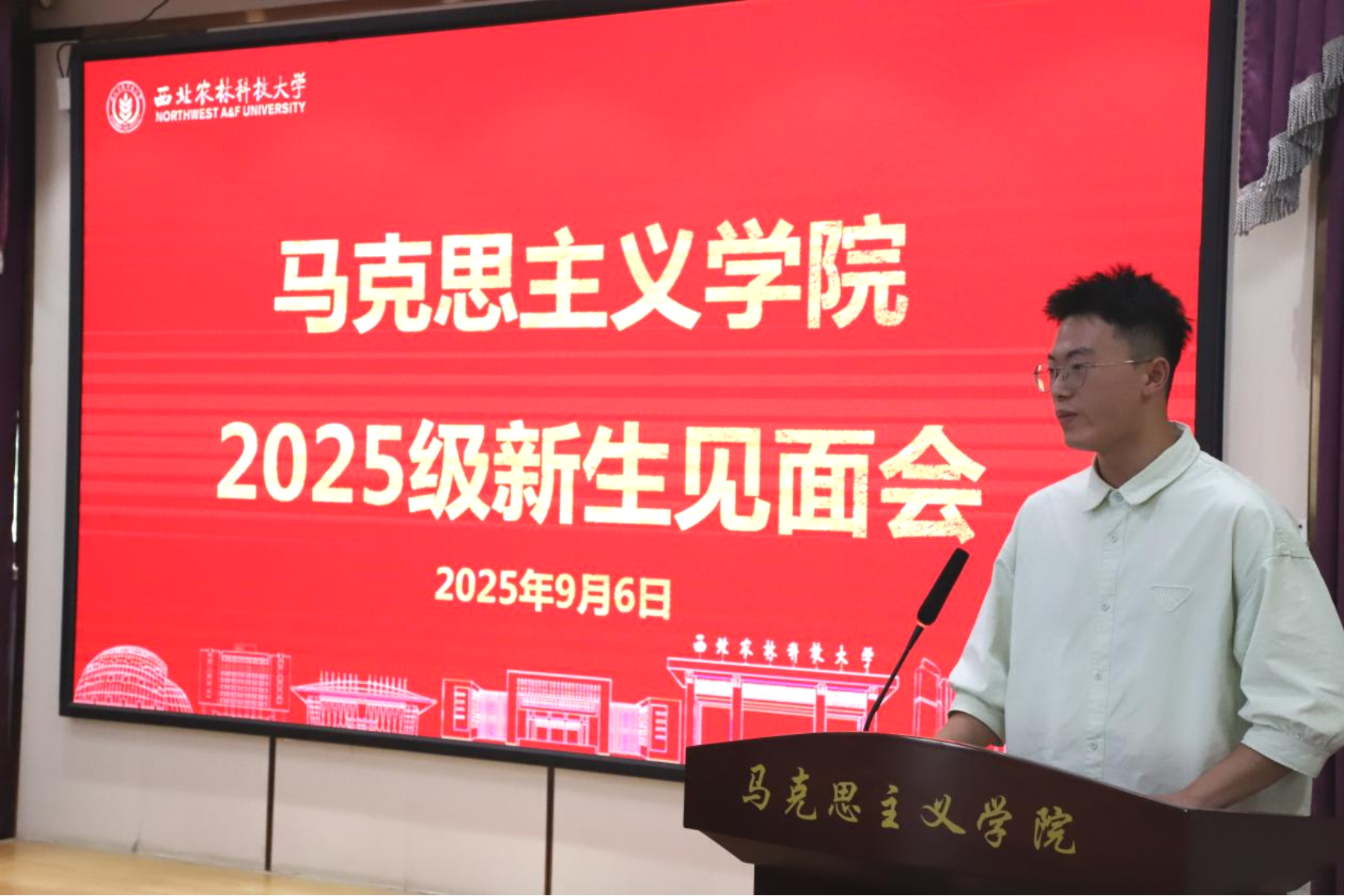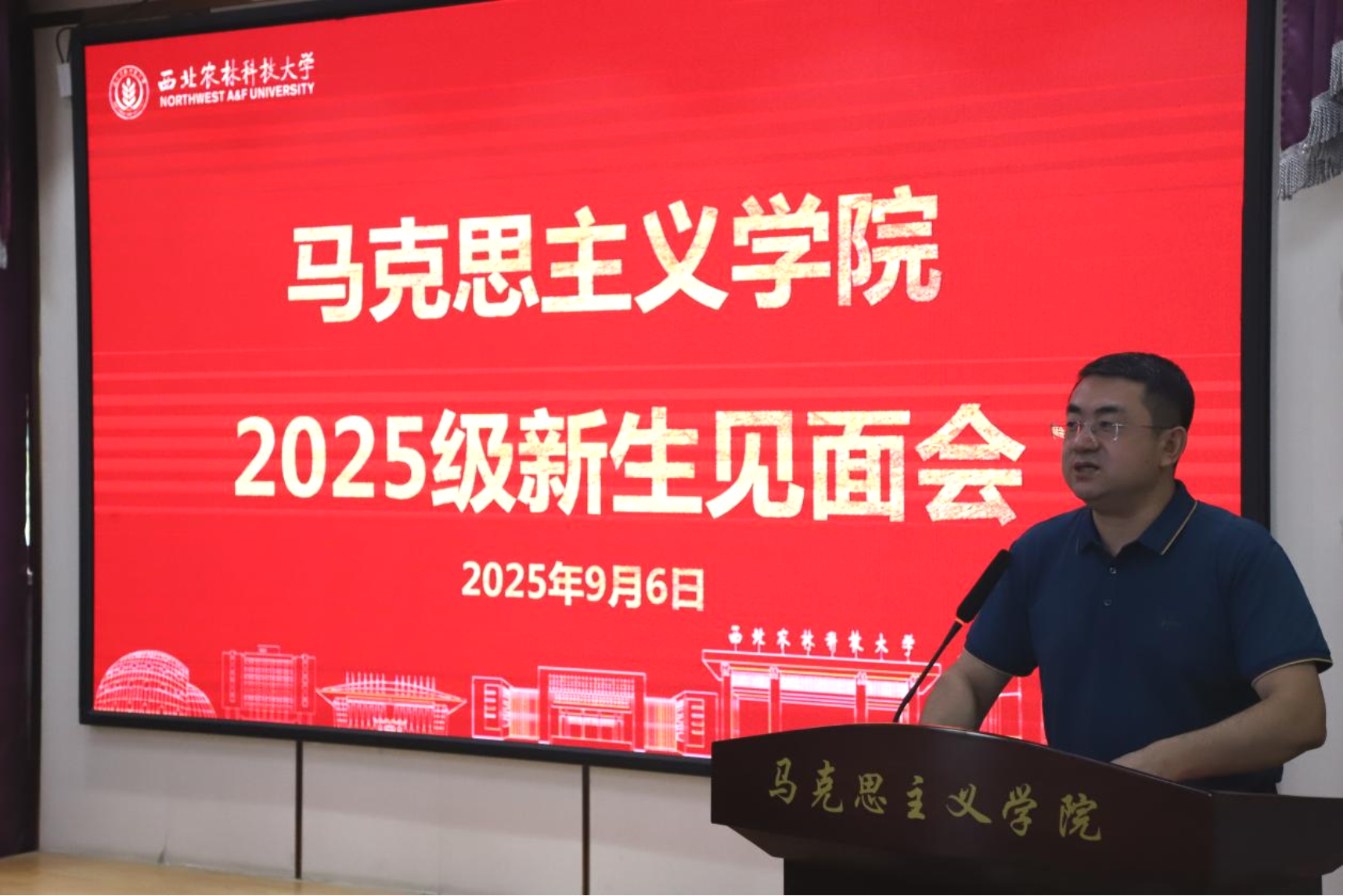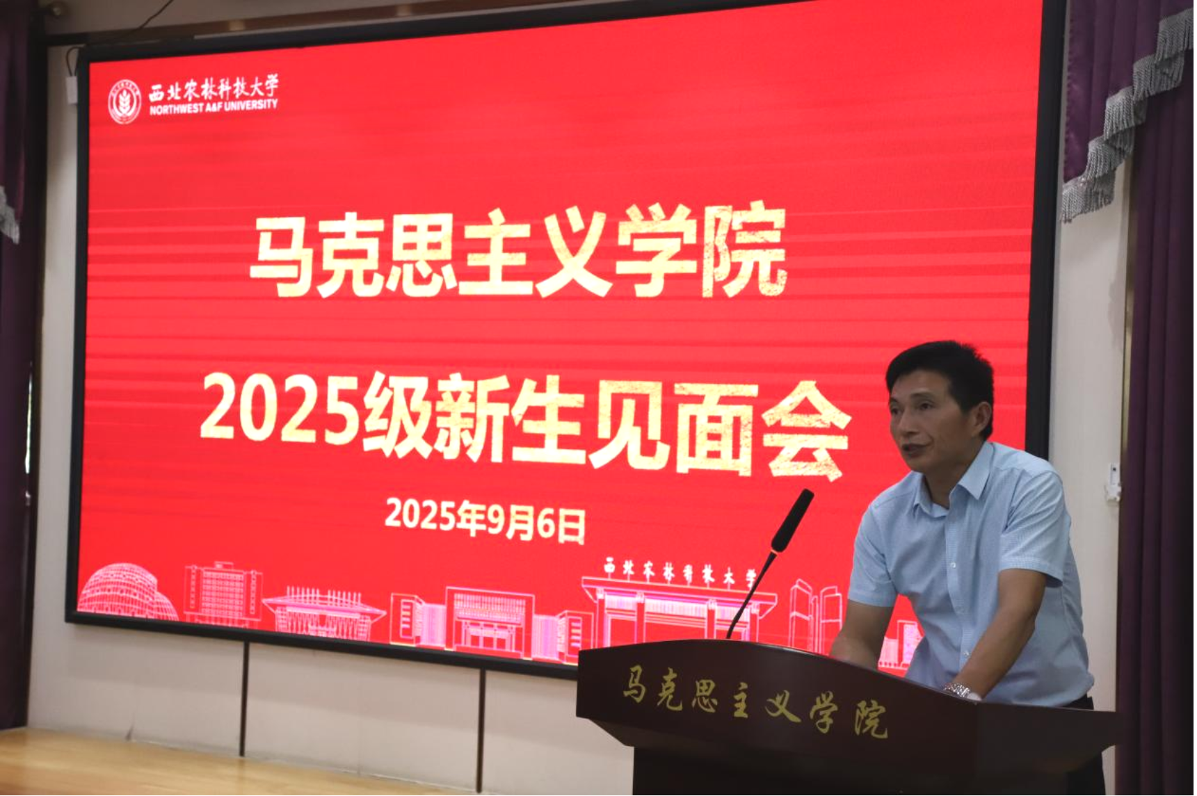 杨鹏教授进行发言,并热烈欢迎2025级新同学来到西农马院开启钻研学习的新征程。杨鹏教授对学科建设历史、专业设置、师资力量等方面进行说明。针对新同学的学习生活,杨鹏教授提出三点建议。一是要真学真信,筑牢信仰之基。他希望同学们能够原原本本、系统地研究经典著作,包括具有代表性的马理论著作以及马理论相关的著名学者的研究成果。二是要知行合一,练就实践本领。他鼓励同学们既要读万卷书,也要行万里路,突出“农本”特色,将论文写在祖国大地上。三是要勇担使命,争做时代新人。他指出,同学们的青春与国家崛起同频共振,是中华民族伟大复兴的见证者,希望同学们能够成为政治坚定、学术精湛、作风优良的马克思主义学者。