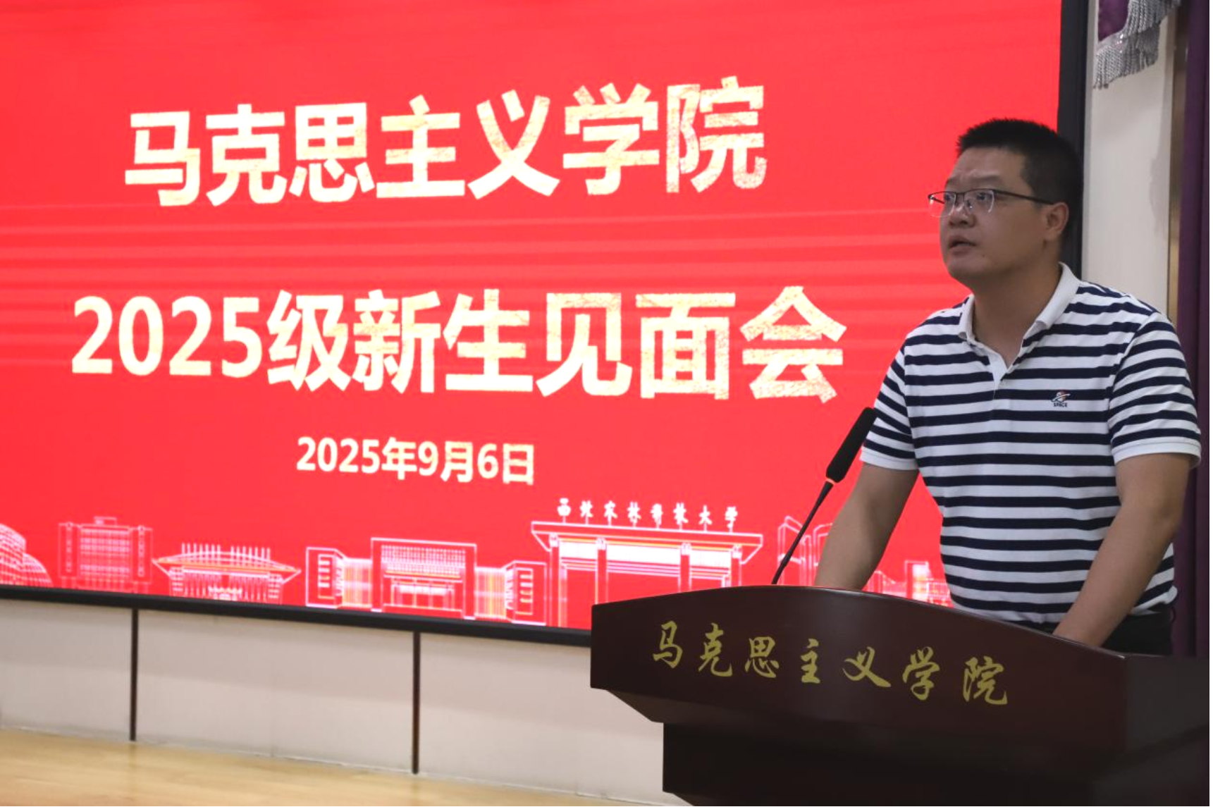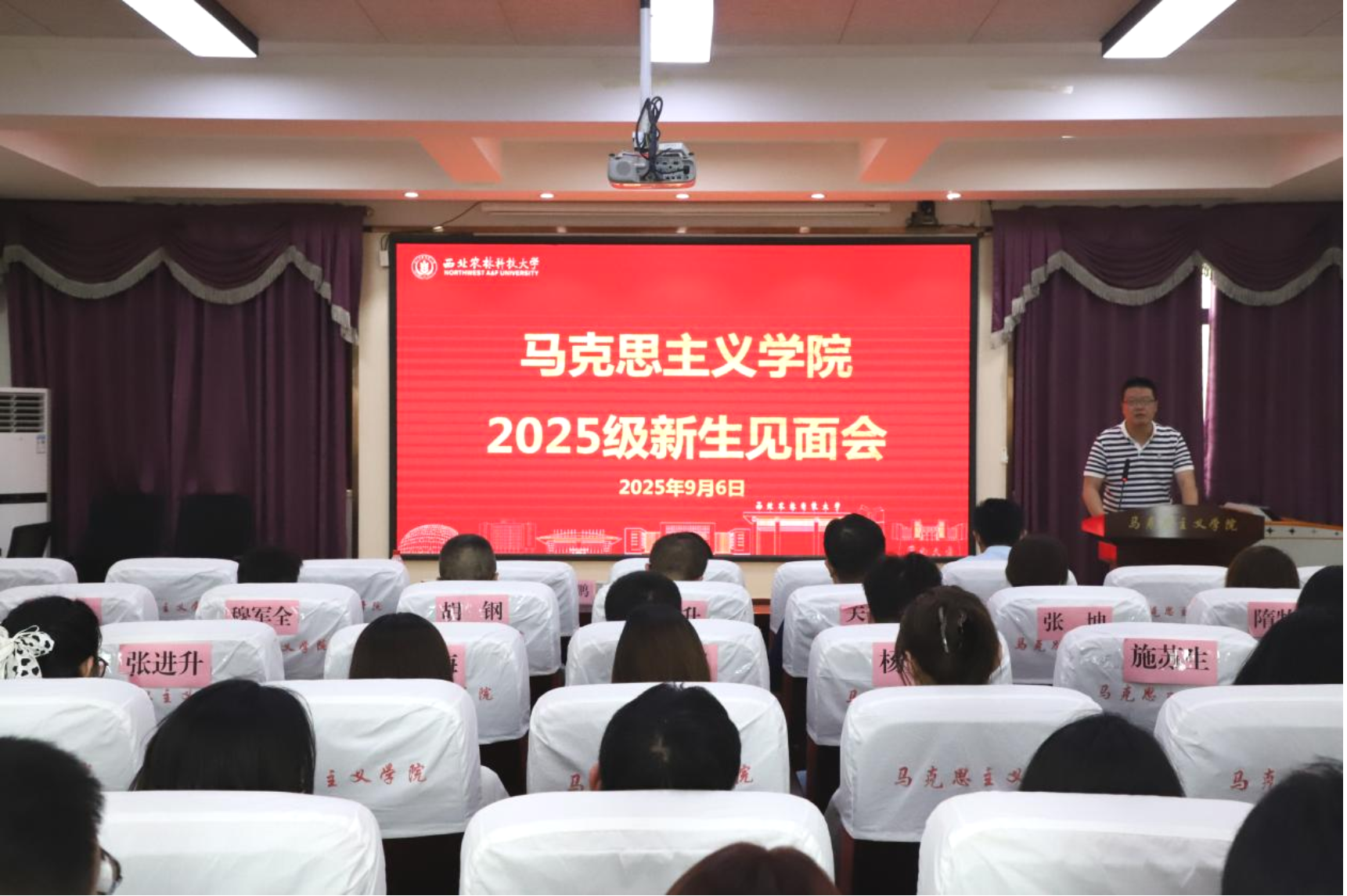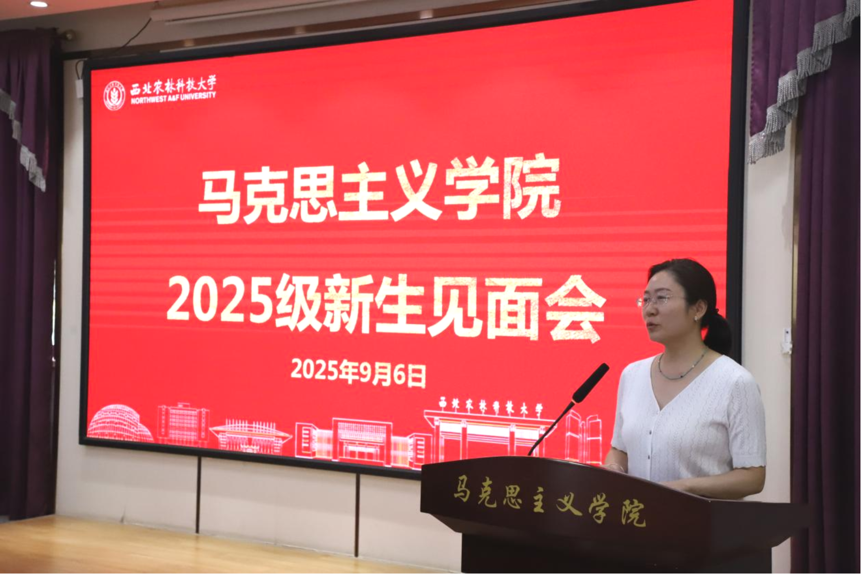 杨鹏教授进行发言,并热烈欢迎2025级新同学来到西农马院开启钻研学习的新征程。杨鹏教授对学科建设历史、专业设置、师资力量等方面进行说明。针对新同学的学习生活,杨鹏教授提出三点建议。一是要真学真信,筑牢信仰之基。他希望同学们能够原原本本、系统地研究经典著作,包括具有代表性的马理论著作以及马理论相关的著名学者的研究成果。二是要知行合一,练就实践本领。他鼓励同学们既要读万卷书,也要行万里路,突出“农本”特色,将论文写在祖国大地上。三是要勇担使命,争做时代新人。他指出,同学们的青春与国家崛起同频共振,是中华民族伟大复兴的见证者,希望同学们能够成为政治坚定、学术精湛、作风优良的马克思主义学者。